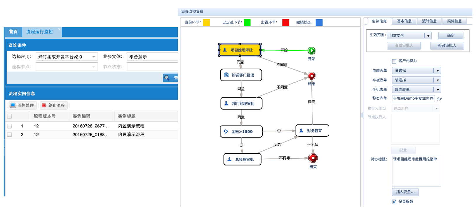 提供配置界面易操作的工作流管理,提供图形化的审批管理界面,可以进行灵活的置;支持工作流预览、测试、快速变更;支持静态指定、条件设定、会签、委派、 规避、征询、抄送、假期规 则等多种控制和设置方式。