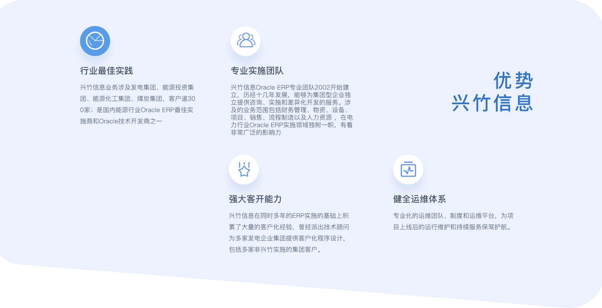 截止目前兴竹信息完成了近十个集团上百项目的Oracle EBS 产品实施服务,积累了大量的火电、化工、风电、水电、燃气发电、核电等不同业态的发电行业ERP实施经验。自2008年,兴竹开始将Oracle EBS产品的实施服务领域拓展至非电领域,并成功完成了化工、煤炭、冶金、酒店、物流等不同行业的Oracle EBS 业务财务一体化项目的实施工作。